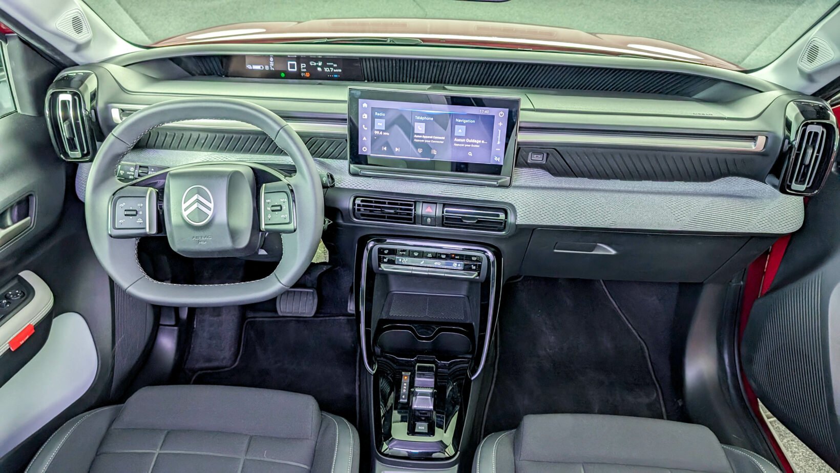 Au second niveau, les commandes de climatisation sont toujours physiques, ce qui n’est pas pour nous déplaire. Ce module électronique est surmonté d’aérations longitudinales conçues dans le prolongement de la planche de bord, qui prend fin avec des aérateurs disposés verticalement. L’habillage en tissu est souple et la forme concave apporte même un peu de relief. Certains y verront sans doute un espace suffisant pour y déposer quelques affaires le temps d’un trajet dans ce petit compartiment.