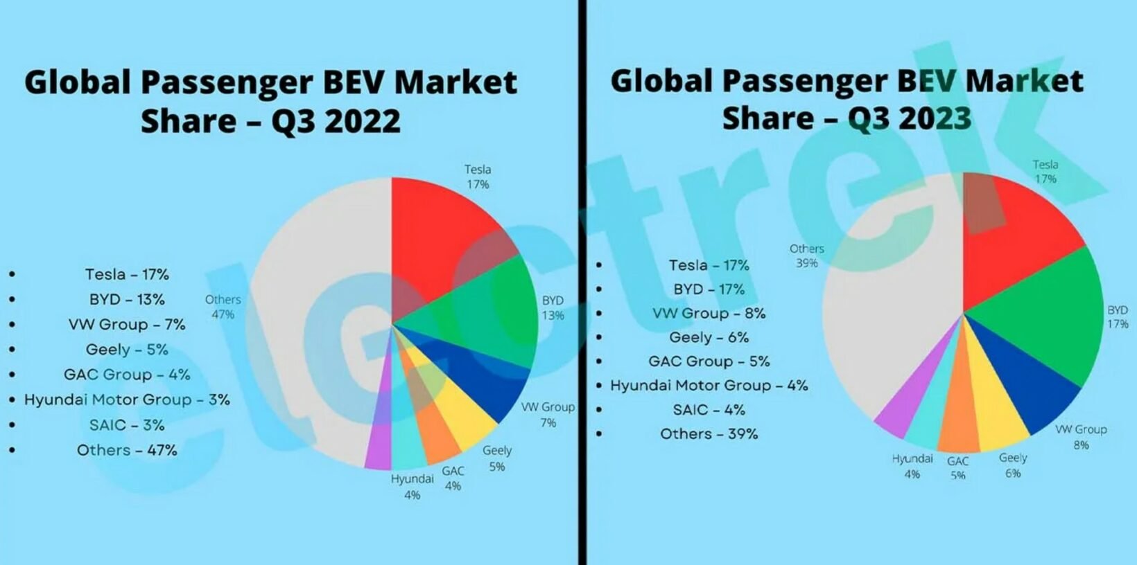 Un an plus tôt, au troisième trimestre 2022, Tesla avait déjà ses 17 % de ventes. De son côté, BYD était à 13 %, mais la marque n’a fait que progresser depuis. Les modèles abordables de BYD séduisent, en faisant certainement un nouveau leader mondial.