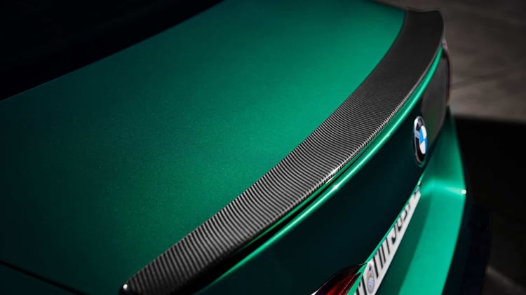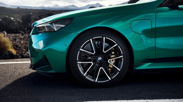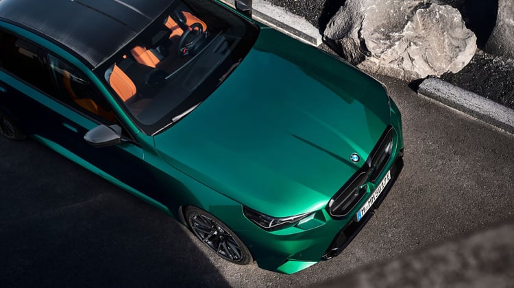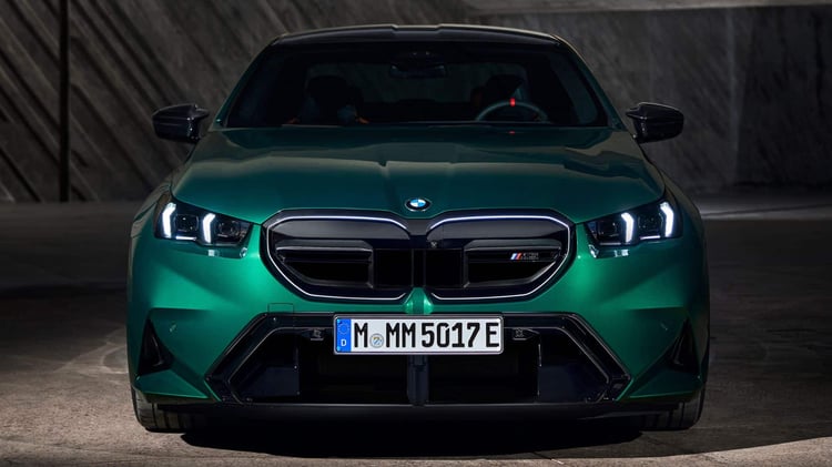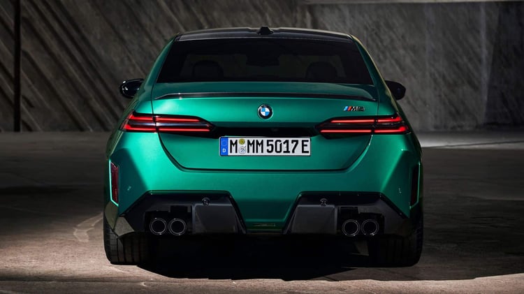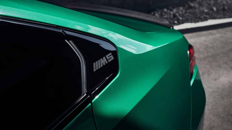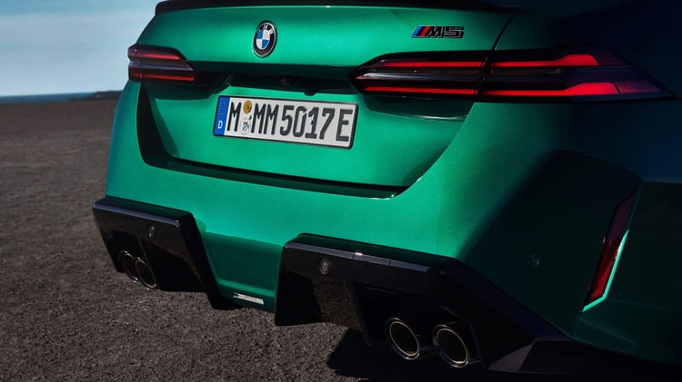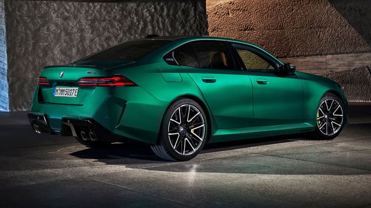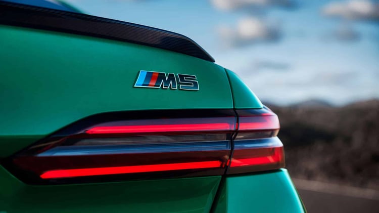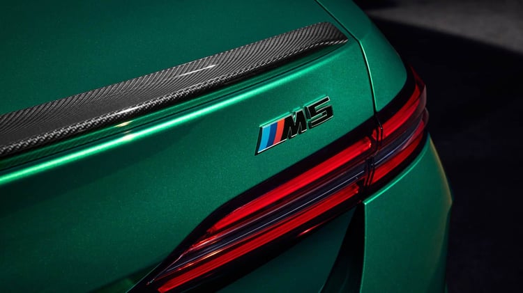 Visuellement, la nouvelle M5 reprend les lignes de la Série 5 (G60) avec un style plus musclé, notamment grâce à des boucliers redessinés et plus agressifs. La face avant se distingue par des prises d’air plus imposantes et des inserts noirs contrastant avec la carrosserie. La calandre double haricot est désormais éclairée. Le capot et le toit présentent des nervures, tandis que les ailes sont élargies. À l’arrière, un diffuseur plus massif qu’auparavant intègre deux doubles sorties d’échappement. La voiture repose sur des jantes M en alliage léger, de 20 pouces à l’avant et 21 pouces à l’arrière. Les acheteurs pourront également ajouter le pack traditionnel M Carbon, incluant des éléments de design spécifiques.
