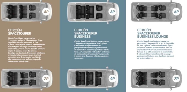 A ces carrosseries, Citroën ajoute deux finitions particuliers de 5 à 8 places, Feel et Shine, dont nous ne connaissons pas encore les équipements. Les flottes et professionnels disposent de leurs propres versions, les Business et Business Lounge, de 5 à 9 places.