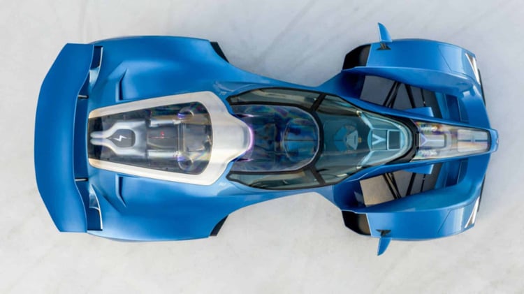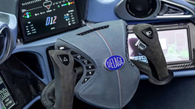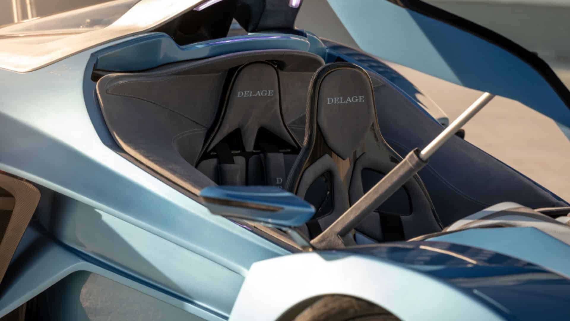 Inspirée à la fois par la Formule 1 et par les avions de chasse, la Delage D12 est une hypercar biplace dont les deux sièges sont situés l’un derrière l’autre, comme dans un avion de chasse. L’accès à bord se fait lui aussi, comme dans un avion de chasse, via le cockpit vitré qui se soulève.
