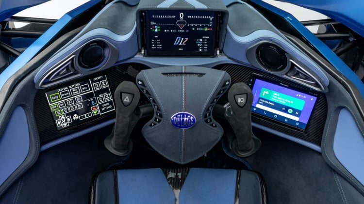 Le siège conducteur de la voiture est spécialement adapté (moulé) à la morphologie du conducteur. Il en est de même pour les joysticks servant de volant, qui sont conçus pour s’ajuster parfaitement à la forme des mains du conducteur. Pas question de prendre du poids après avoir acheté votre D12 au risque de ne plus pouvoir la piloter.