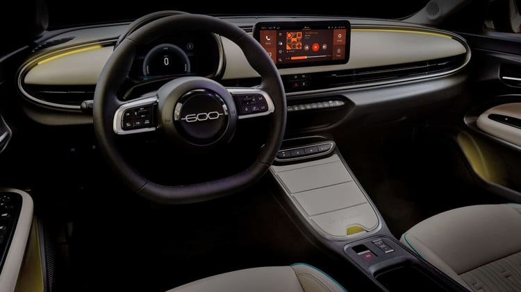 L’intérieur de la Fiat 600e s’inspire de la 500, avec des touches rétro et une présentation attrayante. Le siège conducteur est réglable sur 6 positions et offre également une fonction de massage. La marque annonce un volume de rangement intérieur de 15 litres. Le coffre peut accueillir jusqu’à 360 litres (selon la marque), et une fois la banquette arrière 60/40 rabattue, le volume maximal atteint 1 231 litres.