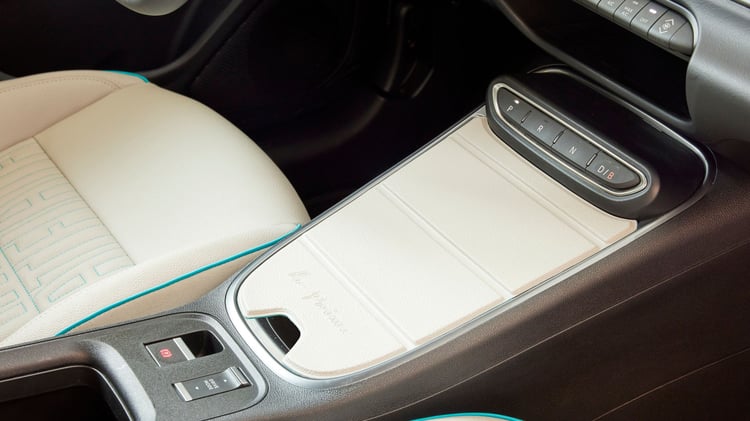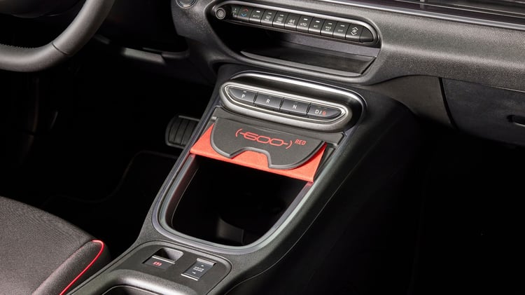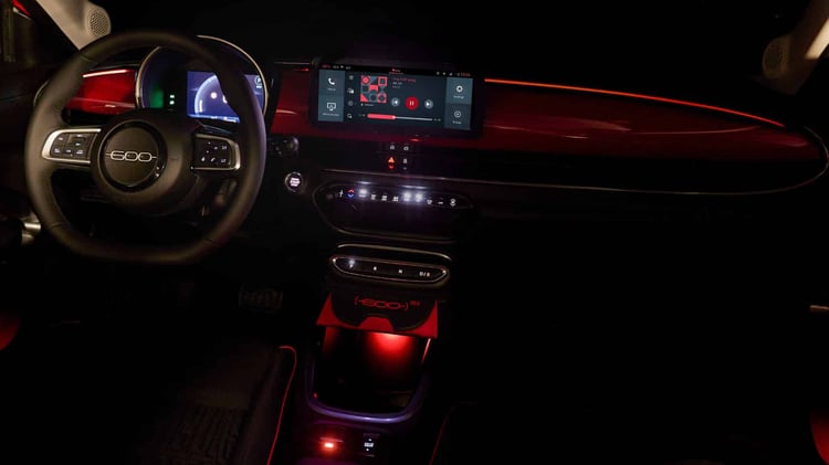 La console centrale de la Fiat 600e est centrée autour d’un écran central de 10,25 pouces, offrant une interface compatible avec Apple CarPlay et Android Auto. Sur les versions d’entrée de gamme, cet écran est remplacé par un rectangle lumineux de 7 pouces. L’ensemble est connecté à un système de navigation TomTom qui permet notamment d’identifier en temps réel les points de recharge publics disponibles.