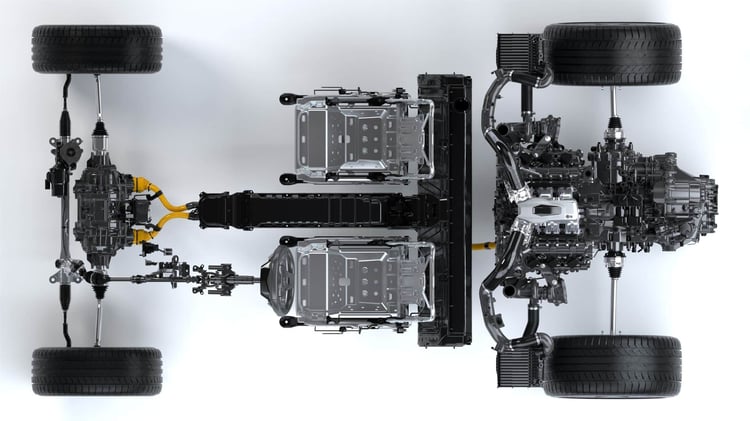 À l’instar de son prédécesseur, la majorité des composants mécaniques de la Honda NSX se trouvent à l’arrière. Coincé entre la boîte de vitesse à double embrayage à 9 rapports et la batterie, positionnée au centre de la structure en aluminium derrière les sièges passagers, le moteur thermique à double injection s’associe à un moteur électrique de 48 ch et 147 Nm. À l’avant, deux autres moteurs électriques assurent la traction intégrale et disposent d’une fonction Torque Vectoring. Ce système offre un avantage majeur : puisque les moteurs électriques n’ont pas besoin de connexion mécanique via un arbre de transmission, leur fonctionnement peut être complètement autonome et réactif, renforçant ainsi la stabilité du véhicule.