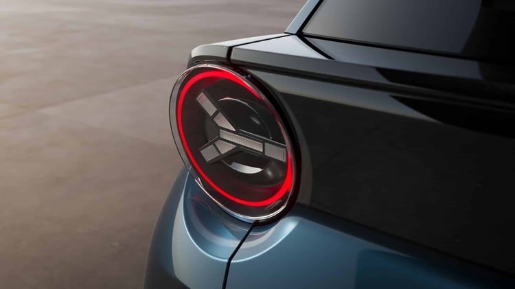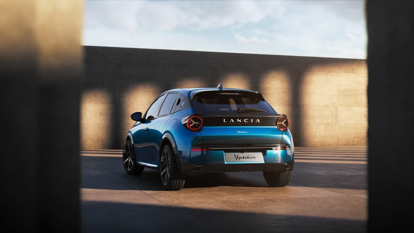 Sur le côté, l’Ypsilon dissimule ses poignées de porte arrière dans une custode noire qui fusionne visuellement les vitres latérales avec la lunette arrière. À l’arrière, l’inspiration vient de la mythique Stratos de Lancia, avec de larges feux ronds connectés par un bandeau noir intégrant le monogramme de la marque.