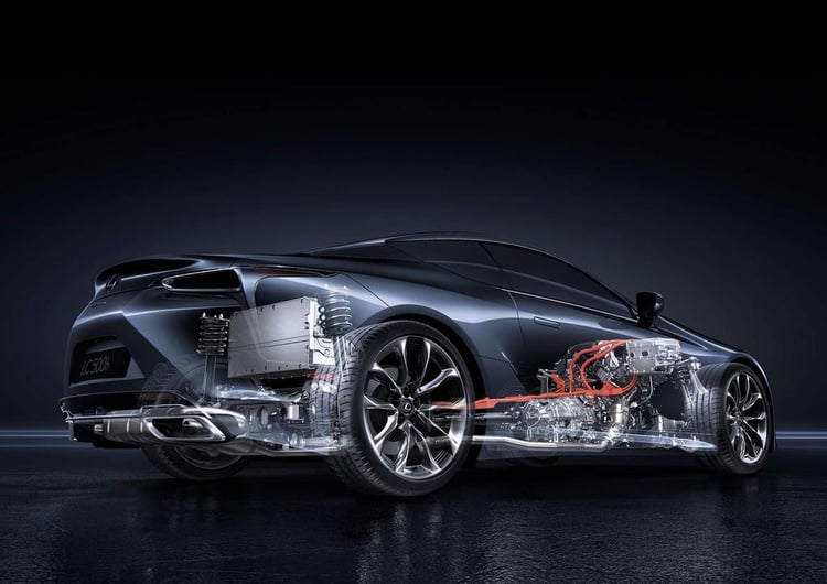 Sous le capot, le LC 500h combine un moteur essence V6 3.5 l de 295 chevaux (220 kW) à un moteur électrique de 44 kW alimenté par une batterie lithium-ion de 44.6 kW.