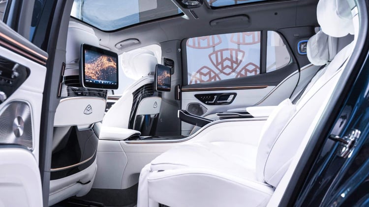 L’intérieur du Maybach est équipé de série de l’Hyperscreen, qui comprend trois grands écrans, dont un pour le passager, sous une seule vitre. Le Maybach dispose d’éléments de design exclusifs, tels que des cadrans d’instruments avec des aiguilles qui ressemblent à des foulards en soie ! À l’arrière, deux autres écrans de 11,6 pouces sont présents, ainsi qu’une tablette tactile pouvant être utilisée à l’extérieur du véhicule. Le système MBUX Assist permet d’activer certaines fonctions en détectant les mouvements du corps et des mains grâce à des caméras.