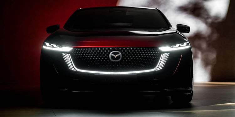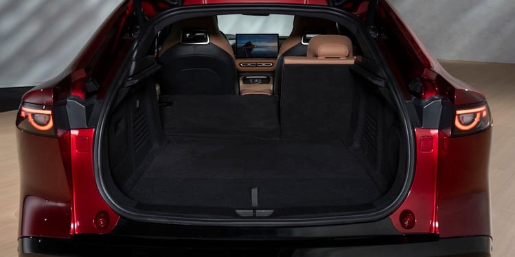 Le design intègre la célèbre calandre en V de Mazda, ici revisitée avec un contour lumineux prolongé par de fines optiques allongées. La silhouette s’inspire des coupés, avec des portes sans encadrement, et un aileron discret est intégré au-dessus des feux. Le véhicule affiche des dimensions généreuses : 4,92 mètres de long, 1,89 mètre de large et 1,49 mètre de haut, avec un empattement de 2,90 mètres. Il offre cinq places et un poids à vide juste en dessous des 2 tonnes (1 952 kg ou 1 953 kg selon la version).