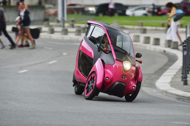 Homologué dans la catégorie des quadricycles lourds, le Toyota i-Road est un modèle à trois-roues animé par deux moteurs électriques de 2kW et revendique une vitesse de pointe de 60 km/h.