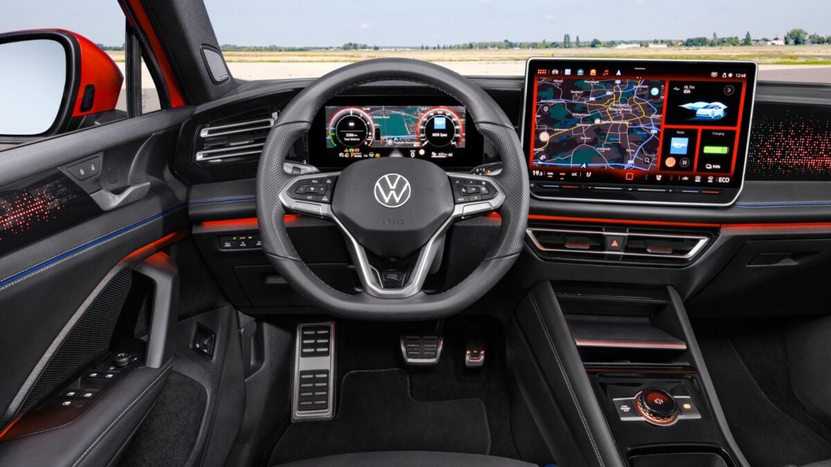 L’intérieur du Volkswagen Tiguan eHybrid a été renouvelé, présentant de nombreuses similitudes avec celui de la nouvelle Passat. Cela se remarque notamment avec le retour des boutons physiques sur le volant et la présence du système d’infotainment MIB4 doté de grands écrans. Il est à noter que l’écran central mesure 12,9 pouces de série, mais peut aller jusqu’à 15 pouces en option. De plus, le « Digital Cockpit » de 12,25 pouces bénéficie d’un traitement antireflet.